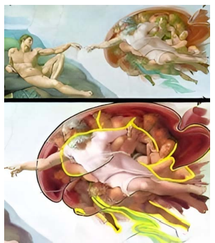 DIOS (YO SUPERIOR) SE ESTÁ ESTIRANDO PARA INTENTAR CONECTAR CON ADÁN (YO INFERIOR), Y ADÁN ESTÁ RELAJADO, SIN MOSTRAR NINGÚN ESFUERZO. ESTA PINTURA MUESTRA QUE TODO LO QUE