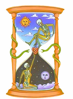 EL CICLO DE LA VIDA Y LA MUERTE SE NOS MUESTRA A MICROESCALA CON EL CICLO DEL DÍA Y LA NOCHE. EL SOL SIMBOLIZA LA VIDA/LUZ ( POR ESO, EN ASTROLOGÍA, EL SOL ES CONOCIDO COMO EL DADOR DE VIDA), Y LA LUNA SIMBOLIZA LA MUERTE/OSCURIDAD. TAMBIÉN LO VEMOS EN EL